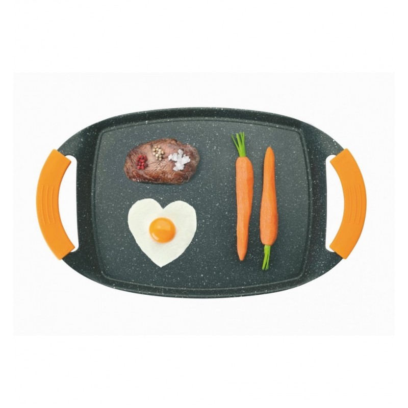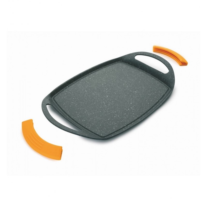 El grill-plancha Basic Stone de Ibili está fabricado en acero fundido de 5 mm de espesor duro y muy resistente a golpes y caídas, y recubierto por un acabado antiadherente estilo piedra libre de PFOA, más sano y ecológico que los antiadherentes tradicionales.