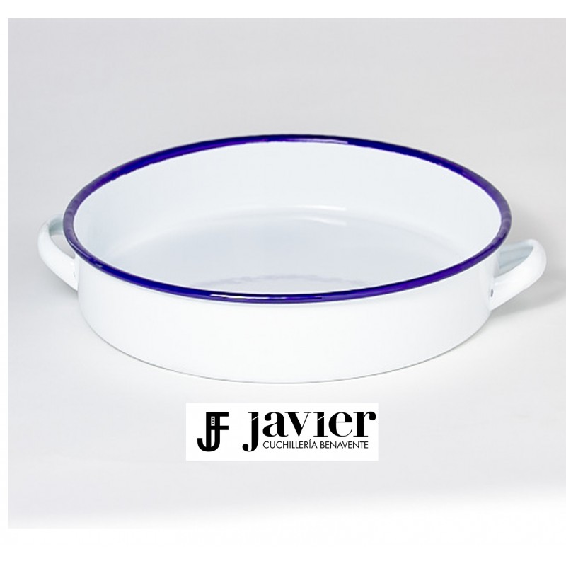 Paellera o fuente redonda con asas en porcelana (esmalte) borde azul de 30 cm de diametro interior y 5 cm de altura.