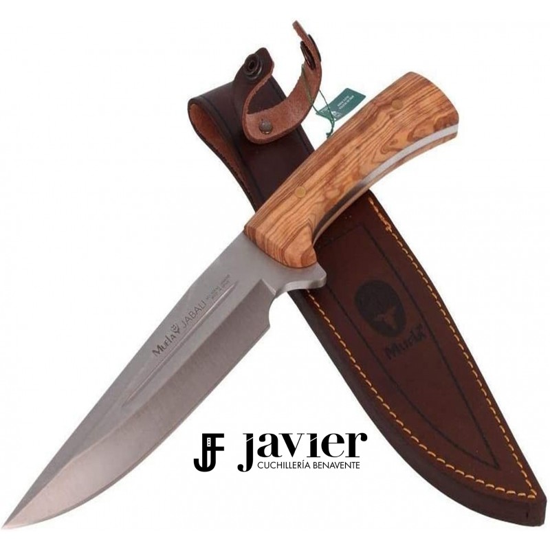 Cuchillo Jabali 17L Ol Muela. Hoja enteriza de acero inoxidable 440 de 170 mm. de largo y 5 mm. de espesor. Cachas de madera de olivo. Funda de cuero marron de excelente calidad.