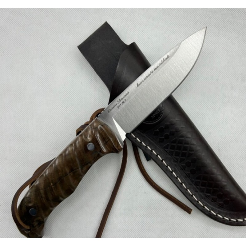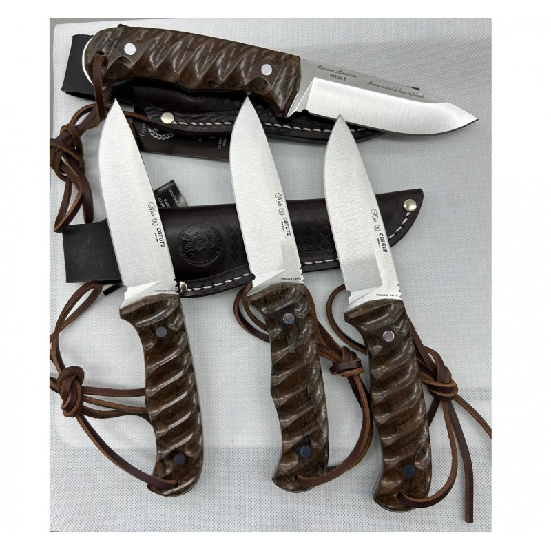 Exclusivo cuchillo Coyote Nieto, en haya estabilizada en 3D. Se trata de una edición limitada de 5 unidades numeradas en el reverso de la hoja. Incluye orificio en el mango con cordon fiador de cuero y funda exclusiva de cuero de alta calidad. Los pasadores del cuchillo y lomo del cuchillo pulido espejo hacen de este cuchillo que aún sea mas exclusivo.