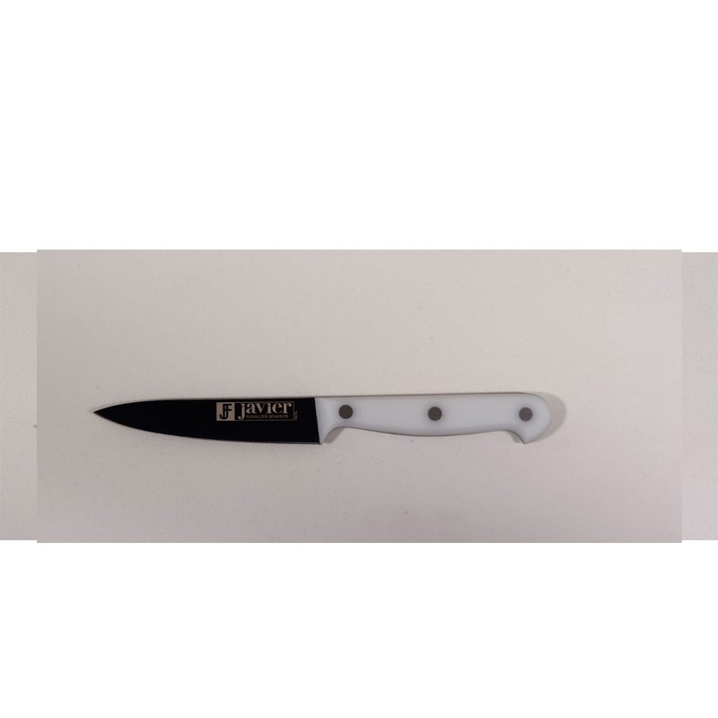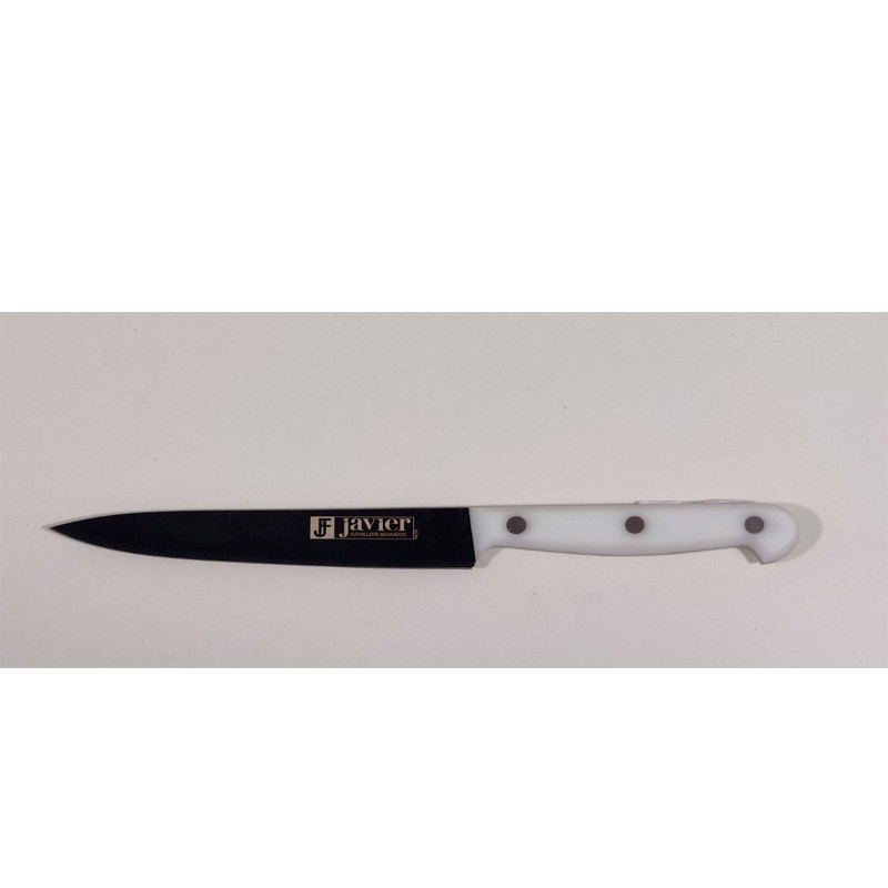 Cuchillo Cocina Enterizo Hoja Teflon Javier, mango blanco con remaches. Apto para uso como cuchillo cebollero y para verduras por la anchura de la hoja.