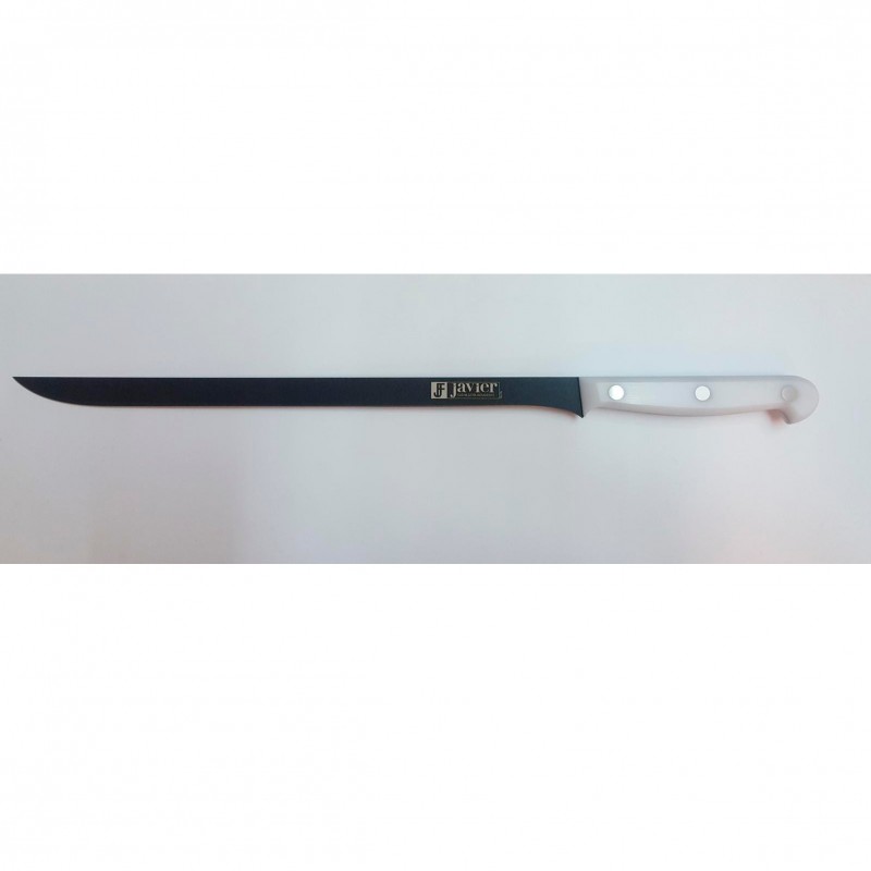 Cuchillo jamonero flexible de 30 cts de hoja. Hoja en acero Molibdeno vanadio, revestido con teflon. Mango en P.O.M ( Polioximetileno) de color blanco.