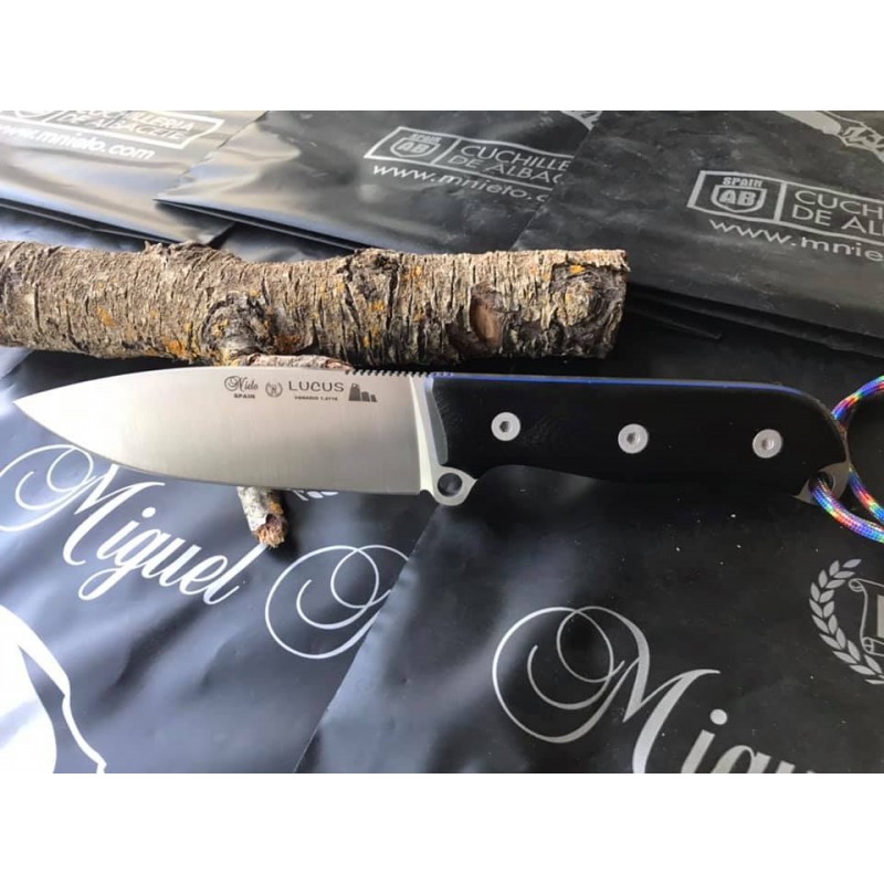 Impresionante cuchillo de supervivencia diseñado por Carlos CJ para Nieto, serie LUCUS , acero vanadio 1.4116 ,vaciado plano con inicio del amolado del angulo, cuchillo enterizo, Empuñadura fabricada en G-10 de color negro, atornillado con tornillos allen, tamaño de hoja 11,5 cm,tamaño total , anchura de hoja de pala 3,5 cm, grosor de hoja 5,2 mm con funda de piel de color negro ,porte vertical y horizontal de primera calidad , con 2 metros de paracord.