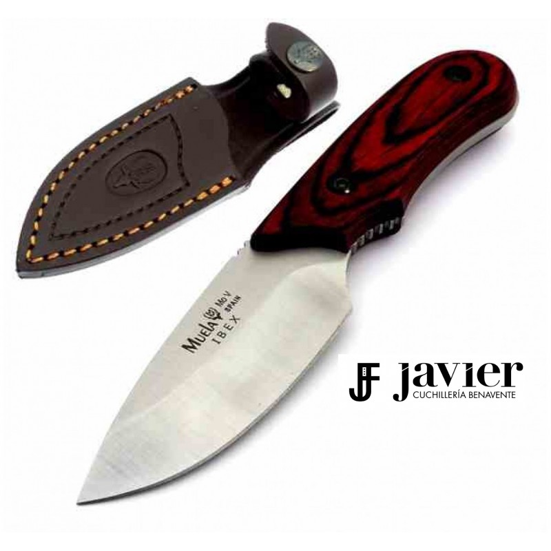 Cuchillo Ibex 8R Muela. Deshollador de muela en micarta color coral de 8 cms de longitud y funda de cuero en color marron.