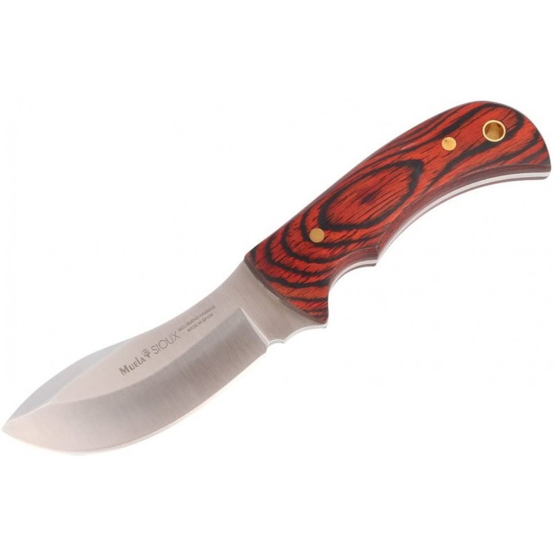 Cuchillo Sioux de la marca muela, con mango de madera prensada en color coral. Incluye funda de cuero de primera calidad en color marron oscuro.