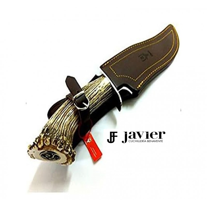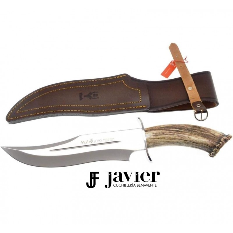 LIQUIDACION STOCK!! Cuchillo Lobo de Muela 23S, Hoja en MO-VA de 23 cms, con mango en ciervo y acabado en roseta con chapa en inox. Lleva la guarda en inox e incluye funda de cuero de excelente calidad.
