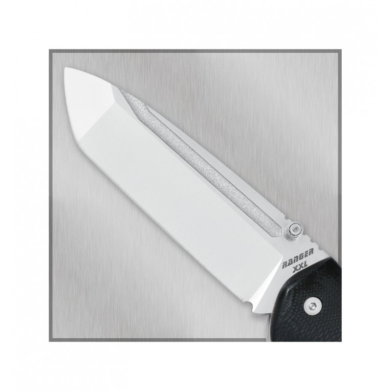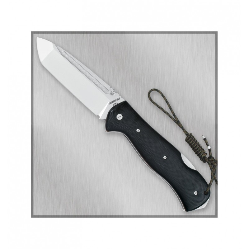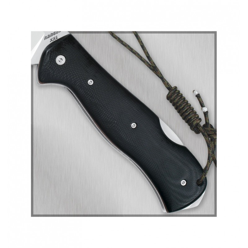 Exclusiva navaja Nieto RANGER XXL diseñada por Manuel de la Torre, hoja de acero Böhler N-695, con sangradera en la hoja por los 2 sitios, con tetón de apertura ambi-diestra, mango de cachas en G-10 con separadores de fibra (VERDE), sujeción con tornillos allen, muelles y forros pulidos a espejo,sistema de cierre de bloqueo, tamaño de hoja 10 cm, total 22,5 cm. funda de nylon
