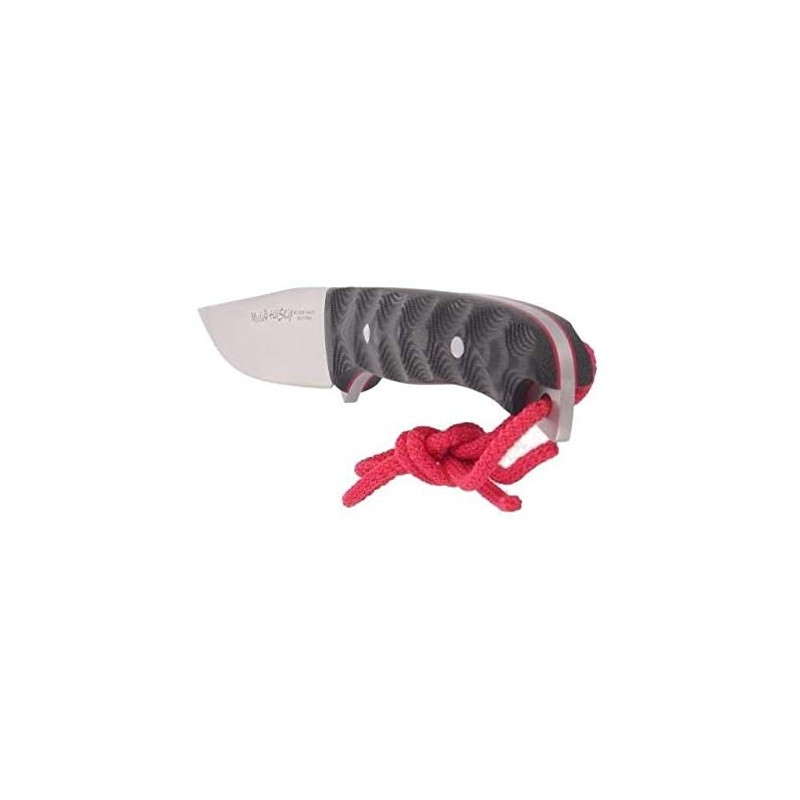 REALIZADO EN ACERO INOXIDABLE X50 CR-MOVa15 CON UNA LONGITUD DE HOJA DE 100 MM, SU MANGO ES DE MICARTA Y DISPONE DE HUECO PARA COLGAR CORDOn FIADOR, SU LONGITUD TOTAL ES DE 225 MM. DISPONE DE FUNDA DE PIEL