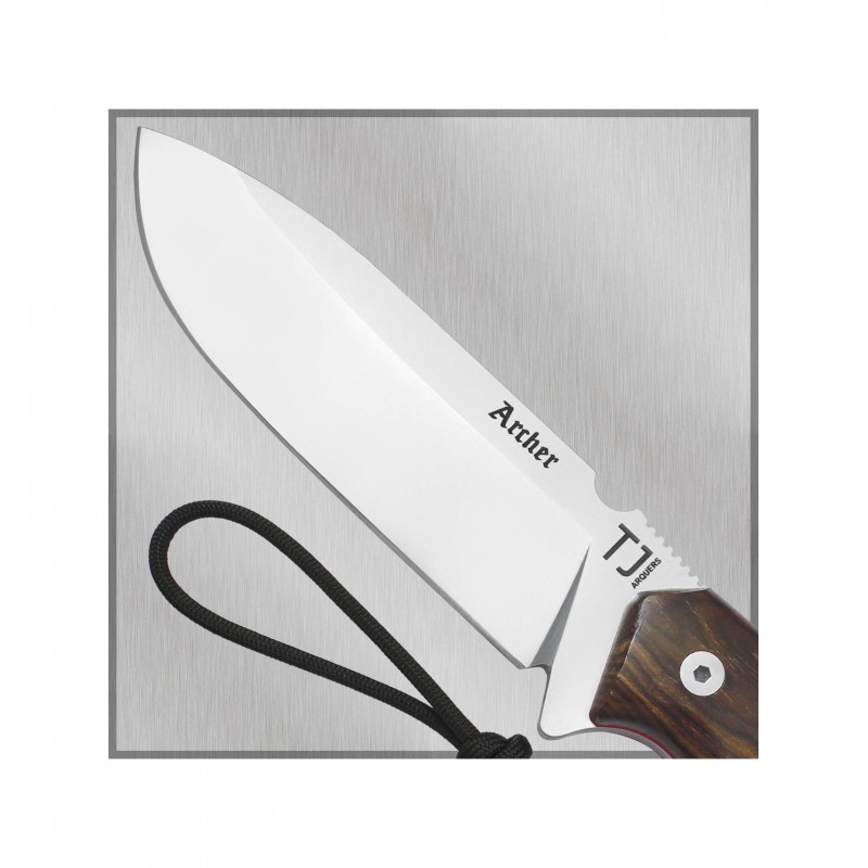 Novedad !!El modelo Archer esta fabricado en una hoja enteriza de acero inoxidable MoVa 1.4116. con muesca en el lomo para raspar la barra de pedernal (fire steel). Empuñadura en OLivo con separadores de fibra de color rojo. Incluye funda de cuero de color negro multiposición.