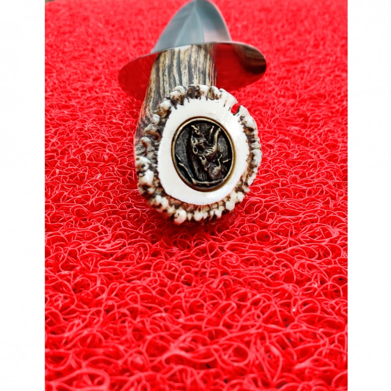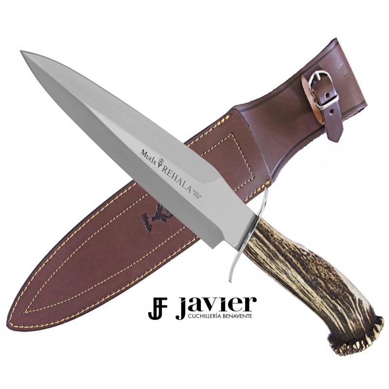OFERTA!! Cuchillo Rehala de Muela. Mango en asta de ciervo con defensa y tacón inoxidable, acero “Nitro-42”, medida hoja 270 mm, grosor hoja 4.5 mm ,con funda de piel de primera calidad.