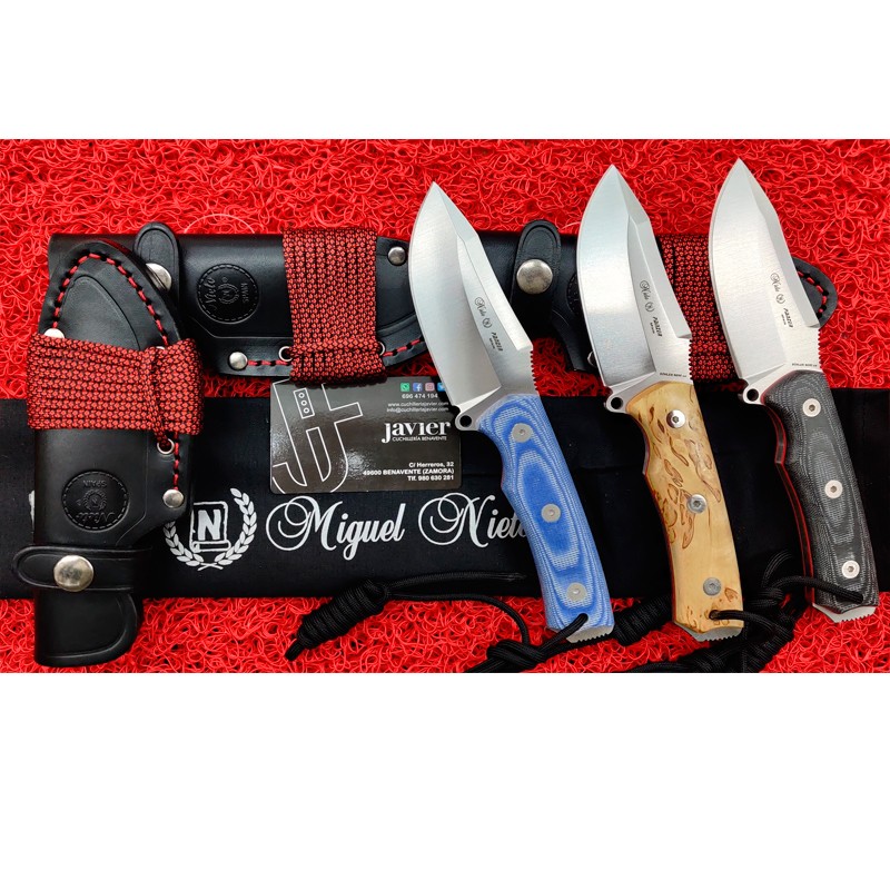 Novedad!! Ya disponible. Exclusivo Cuchillo Panzer Nieto.Diseñado por Manuel de la Torre, hoja en acero BÖHLER N690 Cobalto con dureza HRC 60-61 ,fabricación Española, todo una pieza enterizo, mango en micarta negro, azul o madera de abedul con separadores rojos.Hoja de 9,5cm de largo, total 21cm, ancho de pala 4cm,grosor de hoja 5,3mm, funda de piel de 1ª calidad con 1 metro de paracord rojo.