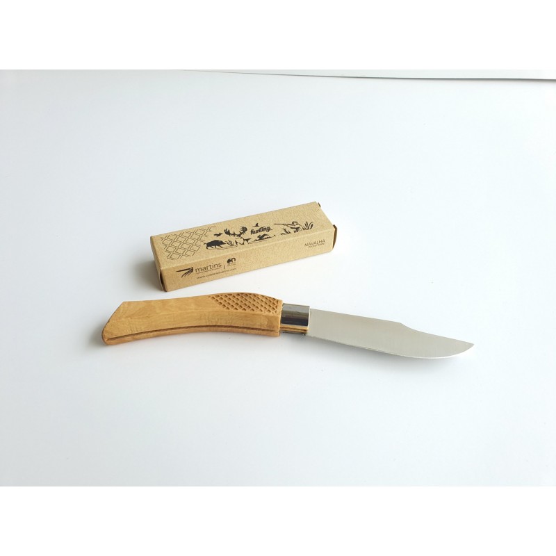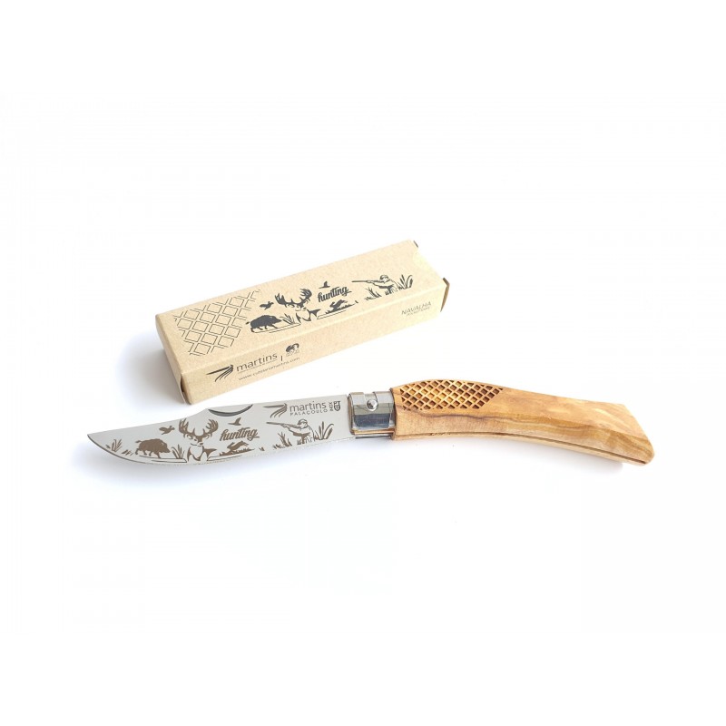 Navaja con motivos de caza grabados en la hoja, y en el mango. Mango en olivo, cierre con virola.
