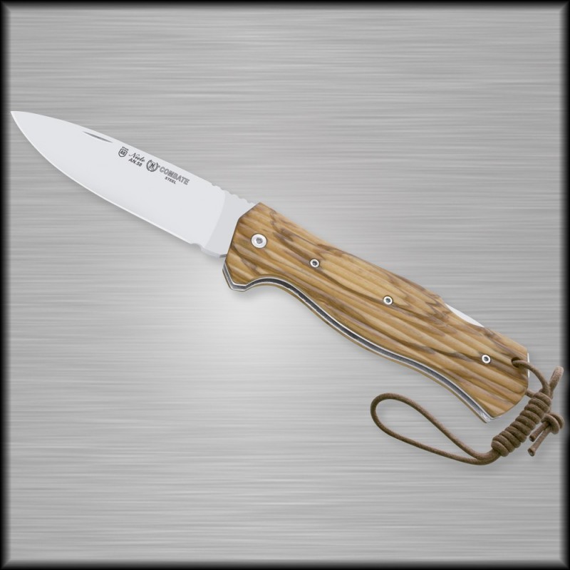 Navaja de supervivencia con sistema de bloqueo. Madera en olivo con surcos tipo 3D.