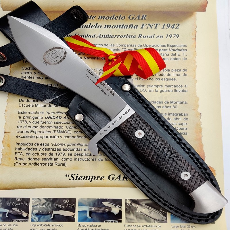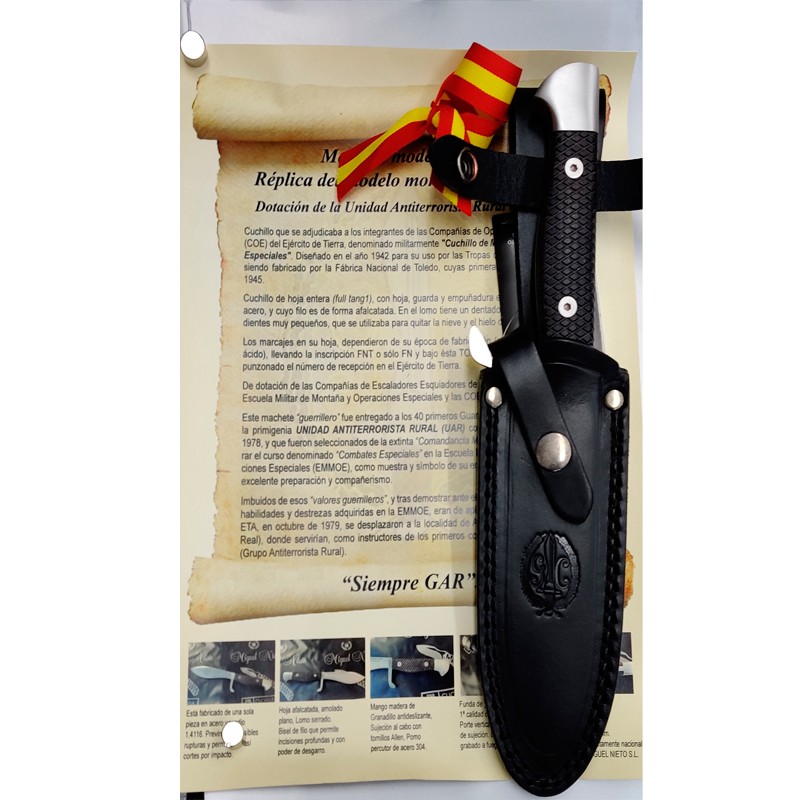 Exclusivo cuchillo Nieto , cuchillo GAR réplica del modelo montaña de 1942 ,dotación de la unidad antiterrorista rural en 1979, todas los cuchillos estarán numerados, acero vanadio 1.4116 ,vaciado plano , contrafilo para el acabado de la hoja , todo una pieza enterizo, mango en granadillo texturizado, y virola de acero, con guarda de acero, atornillado con tornillos allen, tamaño de hoja 15 cm, tamaño total 26cm , anchura de hoja de pala 3,5cm, grosor de hoja 5,2 mm .con funda ambidiestra de piel de piel de primera calidad