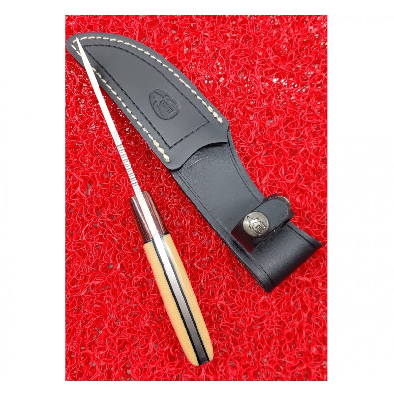 Cuchillo des-hollador descatalogados de muela. Hoja enteriza en MOVa y mango en micarta combinada blanca- marron.