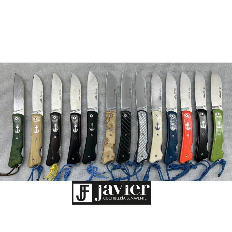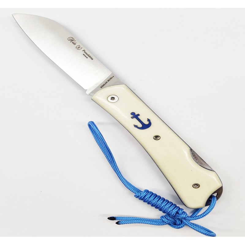 Oferta FLASH!! Hasta fin de existencias. Navaja Exclusiva modelo Poseidon en micarta blanca, con ancla azul. hoja acero Böhler N-690 cobalto, separadores de fibra azules, sujeción con tornillos Allen, con ancla inox 304, muelles y forros pulidos, sistema de cierre de bloqueo, tamaño de hoja 8 cm. Pocas unidades disponibles.