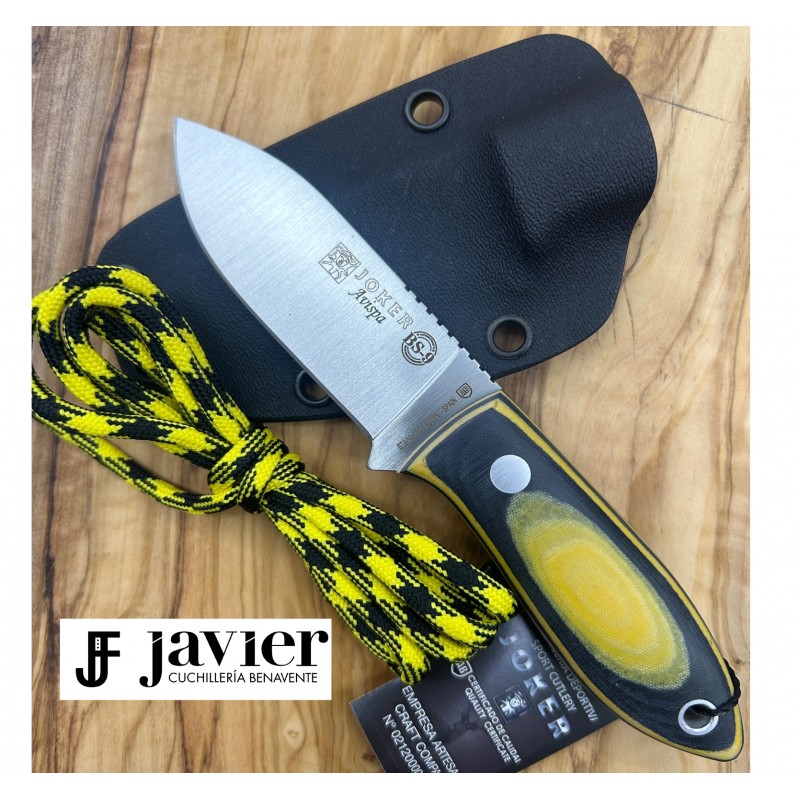El Cuchillo de Cuello o Neck Knife y Supervivencia Joker BS9 Avispa es de hoja enteriza fabricado en acero inoxidable Sandvik 14c28n con un largo de hoja de 7,5 cm, un grosor de 3,7mm, el largo del mango es de 8,5 cm y se puede adquirir en diferentes acabados como micarta canvas amarillo y negro o micarta canvas naranja.