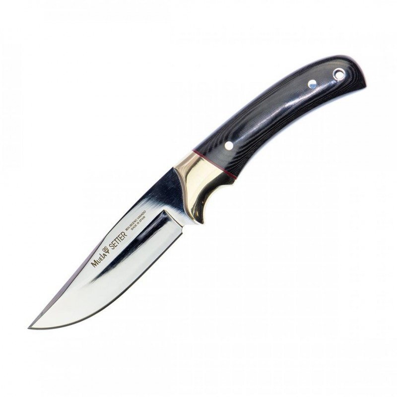 Cuchillo setter 11M, de muela. Hoja de 11 cm y mango en micarta negra con virola de laton. Incluye funda de cuero de excelente calidad.
