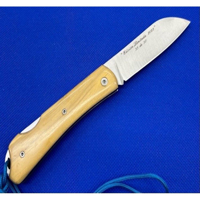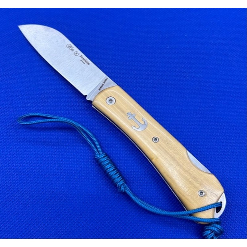 Navaja Poseidón de Nieto, en madera de Boj. Edición Limitada de 50 unidades, numeradas en el anverso de la hoja. Hoja en acero Bohler N-690 cobalto y ancla del mango en inox. Separadores de fibra en color azul y rabiza en azul.
