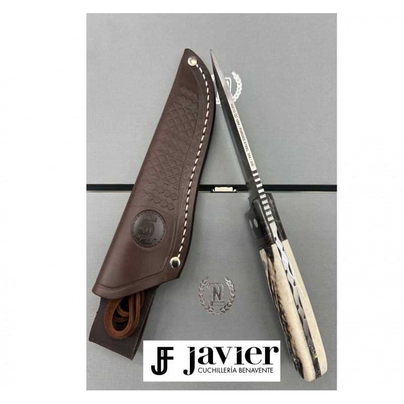 Cuchillo de colección de la linea ARt-19. Pieza nº 54 de 200. Se trata de la pieza de la foto. Mango en CIERVO y virola en CHOPO estabilizado, incluye funda con cordura de piel y estuche de presentación en madera.
