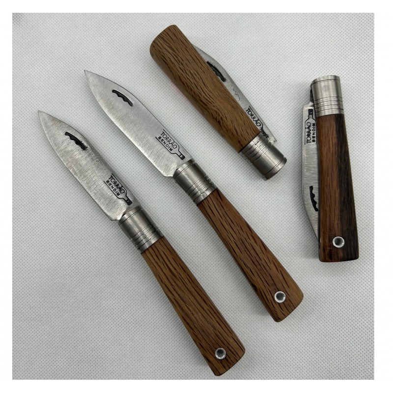 Navaja artesanal tipo cabritera, hecha totalmente a mano por el Artesano Torrao (Sendim) de Portugal. Hojas en varios tamaños de acero al carbono y madera de encina. Cierre de friccion. Grosor hoja aprox 2 mm.