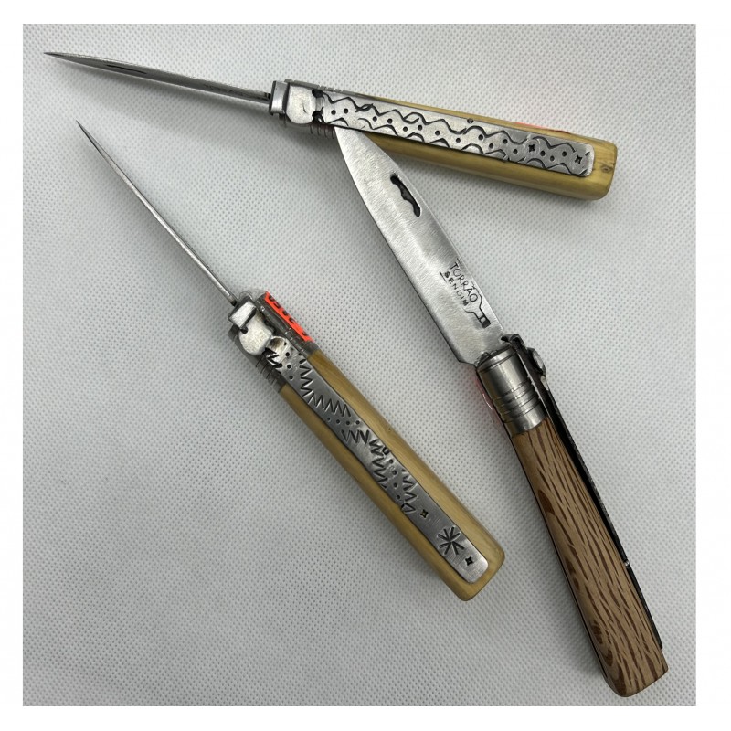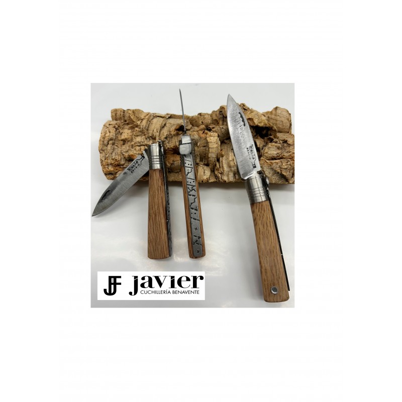 Navaja artesanal tipo cabritera, hecha totalmente a mano por el Artesano Torrao (Sendim) de Portugal. Hojas de acero al carbono y madera de boj o encina. Tamaños de hoja 7,5 cts y 8,5 cts aproximadamente. Cierre de sistema con bloqueo parecido al cierre de ventana pero al exterior. Muelles decorados a lima. Grosor hoja aprox 2 mm. Grabado