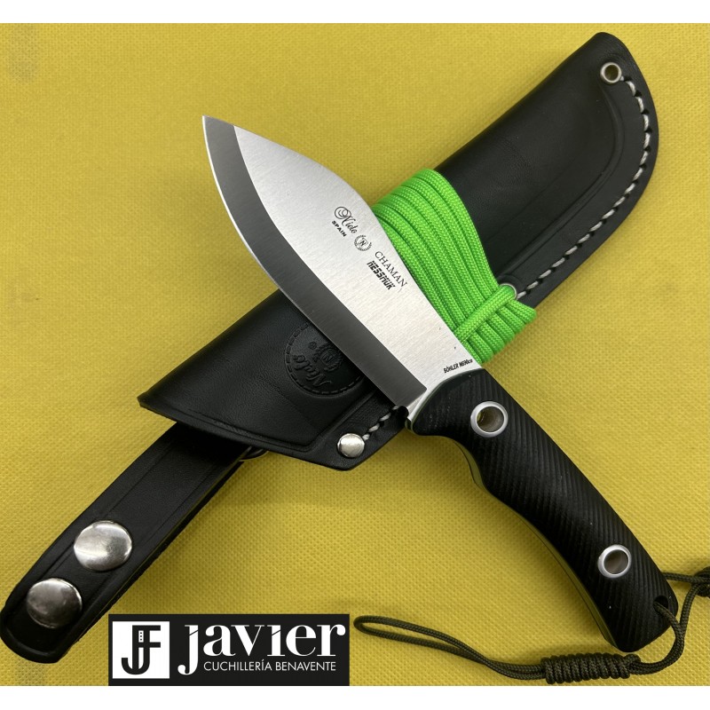 Novedad!!! Nuevo Cuchillo de la casa Nieto, modelo Chaman Nessmuk mango en G-10 y hoja en acero Bohler N690Co, con vaciado Scandi y funda de cuero de excelente calidad. Incluye Paracord 550, tamaño de hoja 10 cts y longitud total 21 cm y grosor de hoja 3,5 mm.