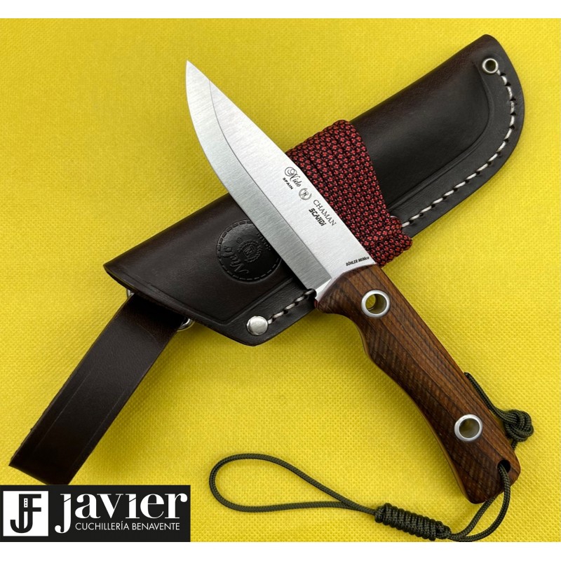 Novedad!!! Nuevo Cuchillo de la casa Nieto, modelo Chaman SCANDI mango en Cocobolo diseñado por Manuel de la Torre, hoja enteriza en acero Bohler N-690Co, con vaciado Scandi a cero y funda de cuero de excelente calidad. Incluye Paracord 550, tamaño de hoja 10 cts y longitud total 21 cm y grosor de hoja 3,2 mm.