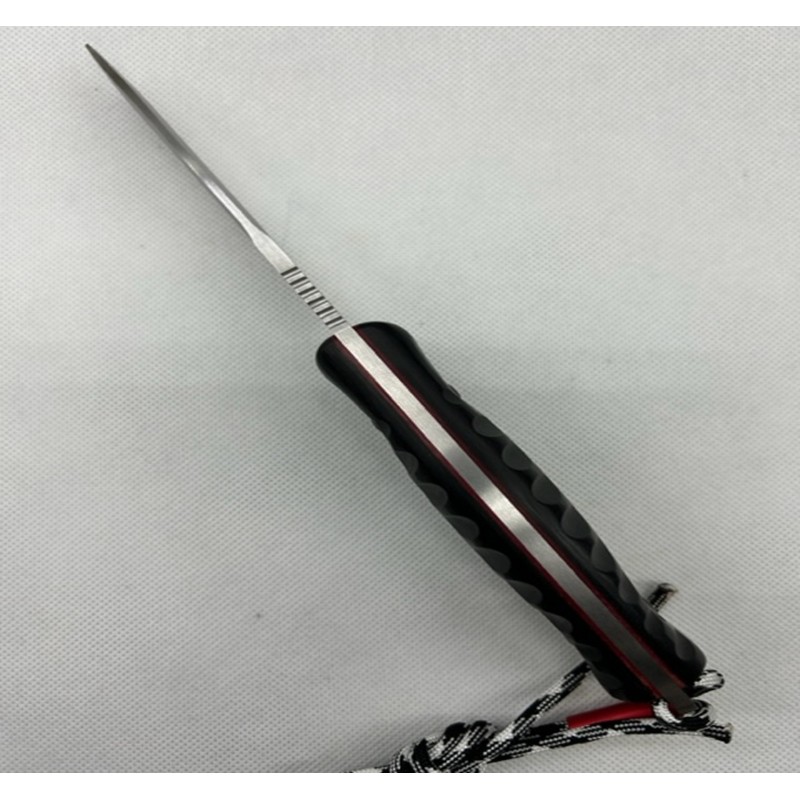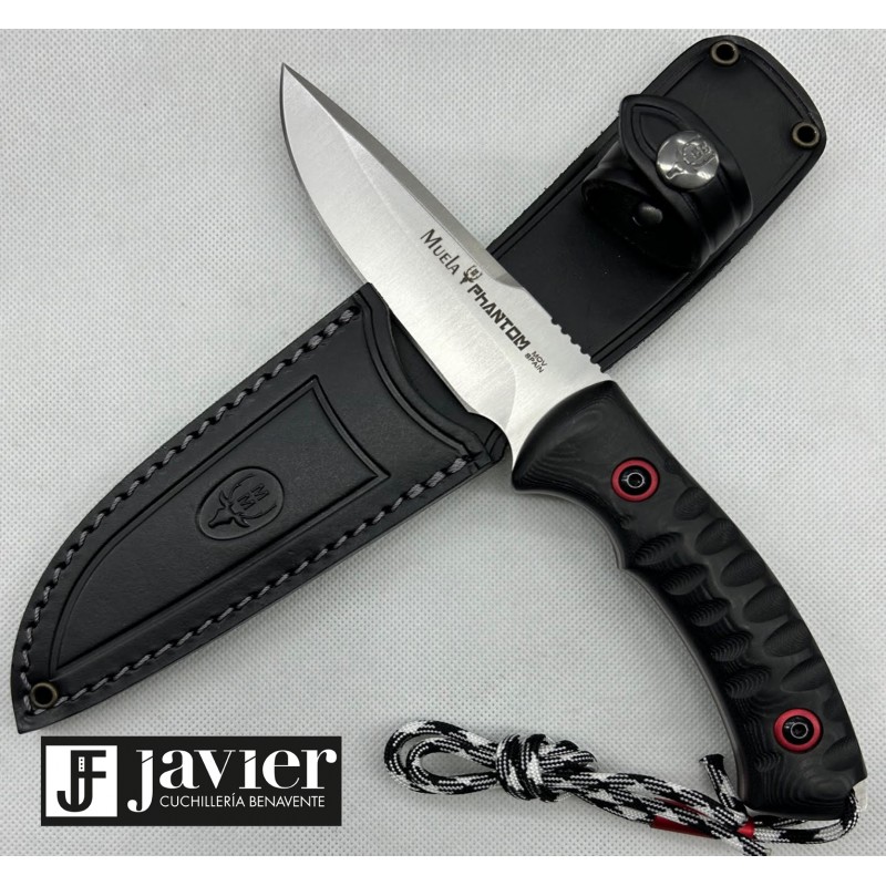 NOVEDAD Cuchillo Phantom-12W de Muela. Mango en micarta color negro con separadores y tornilleria en color rojo, y funda de cuero en negro con rivetes rojos en excelente calidad.