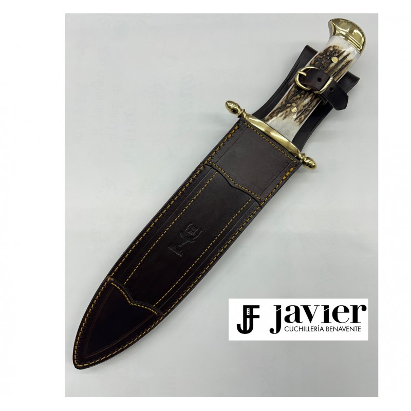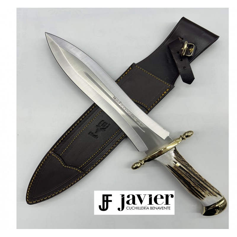 Cuchillo español Muela especial para remate con hoja de lengua de vaca y doble filo. Doble guarda de latón. Empuñadura con cachas de asta de ciervo. Pomo reforzado con latón. Espiga completa y vista.
