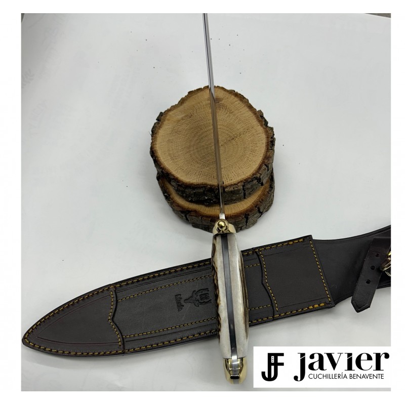 Empuñadura: asta de ciervo. Peso: 655 grs. Funda: cuero.