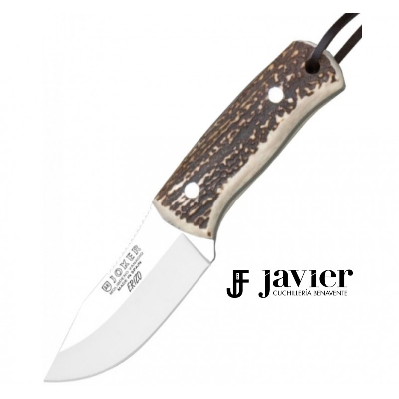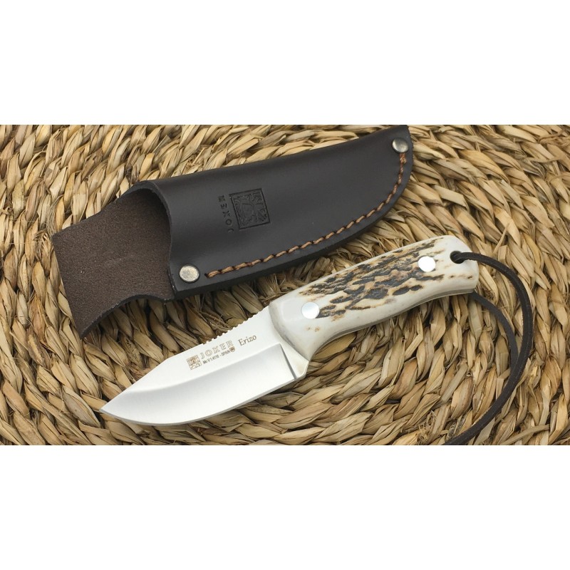 Cuchillo Joker Erizo, enterizo con mango de ciervo y funda de cuero de excelente calidad. Largo de hoja 7,5 cts y punta tipo clickpoint en acero moba 1.4116.