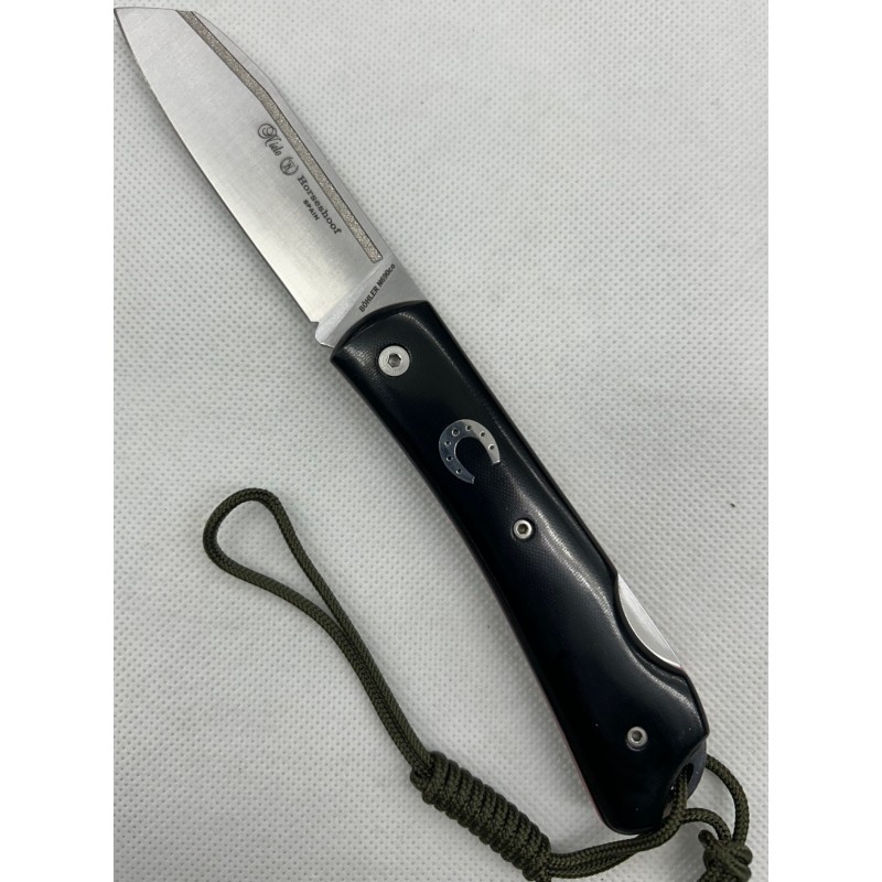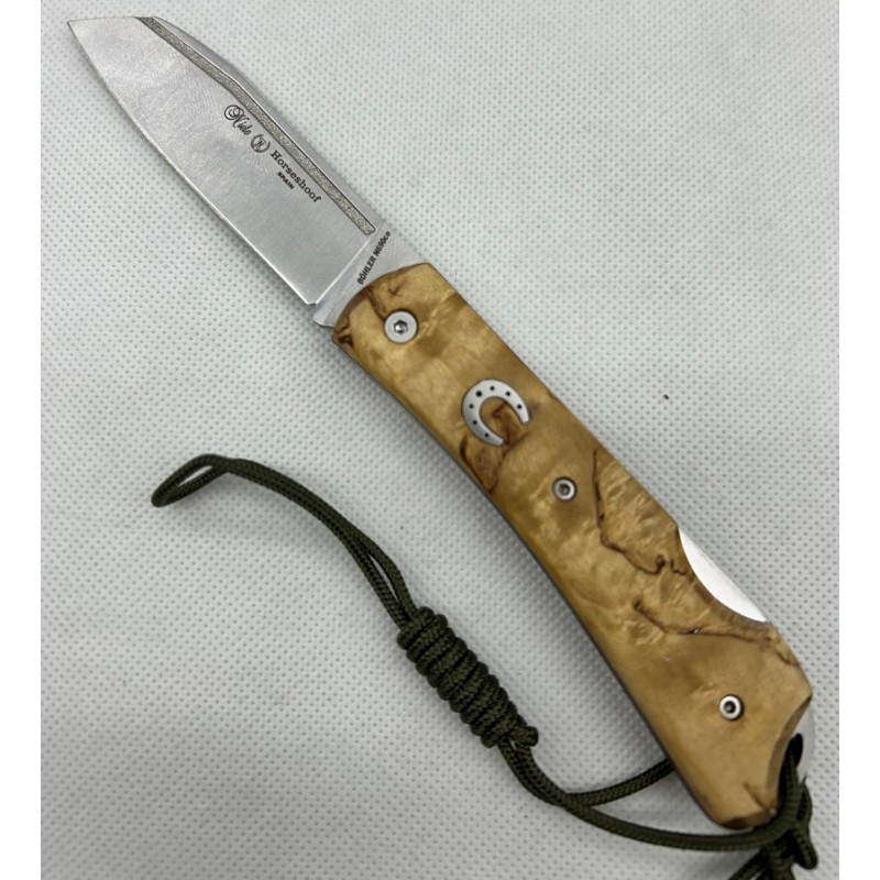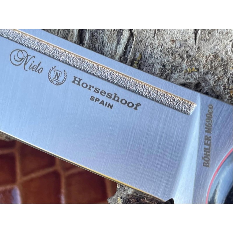 NOVEDAD!! Navaja Nieto Horseshoof. Longitud hoja 8 cts, fabricada en acero Bohler N690 cobalto con amolado plano hasta el lomo e inicio en ángulo. Incrustacion de herradura de la suerte en acero inox 304. Canal en ambos lados de la hoja. tornilleria allen, y hoja pulido a espejo.
