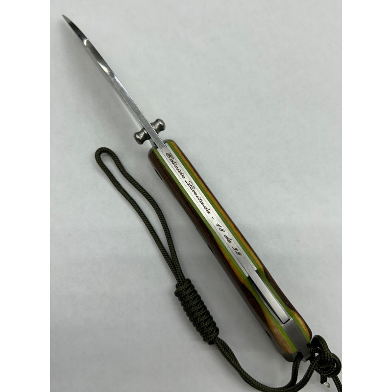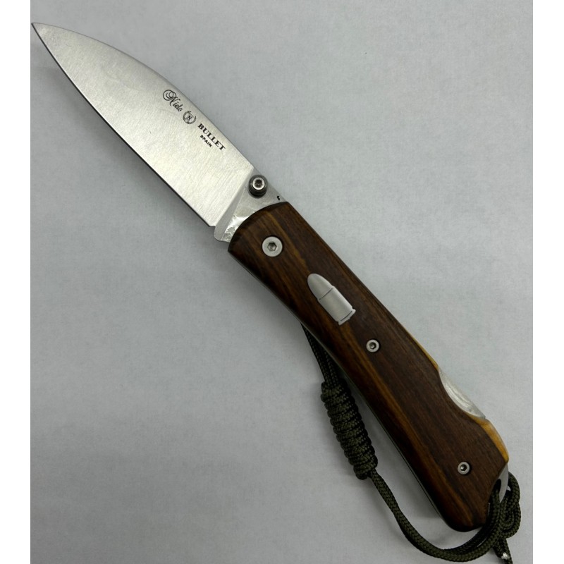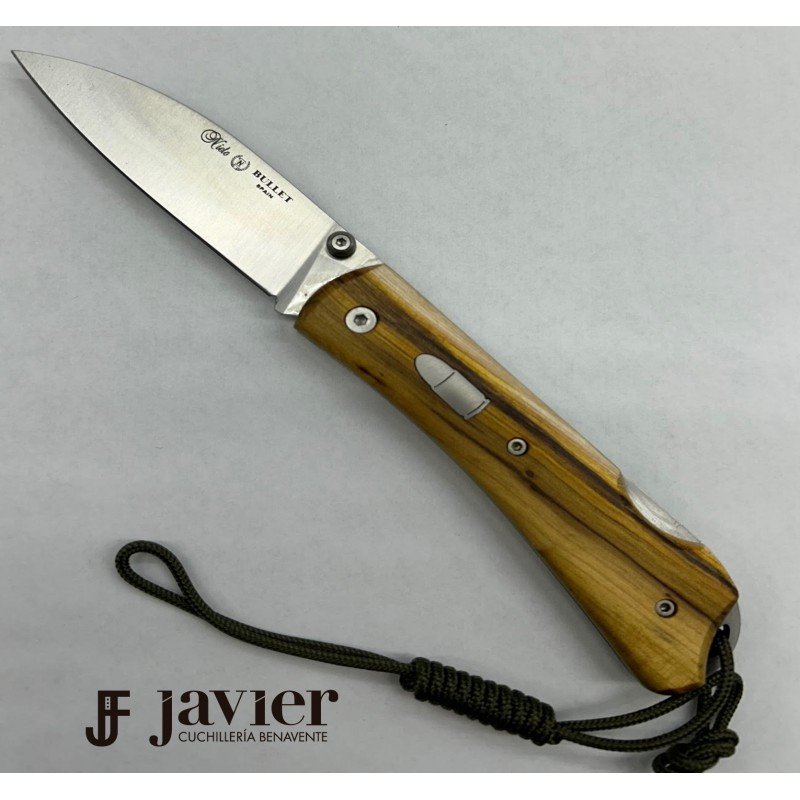 Navaja Bullet Nieto en madera de pistacho, exclusiva para cuchillería Javier. Edición limitada de 32 unidades numeradas en el lomo. Hoja en acero Böhler N690 cobalto de 3mm de espesor con amolado plano hasta el lomo e inicio en ángulo. Hoja de 8.2cm de largo con tetón de apertura a una mano ambidiestro. Sistema de bloqueo back-lock. Separadores en color lima.
