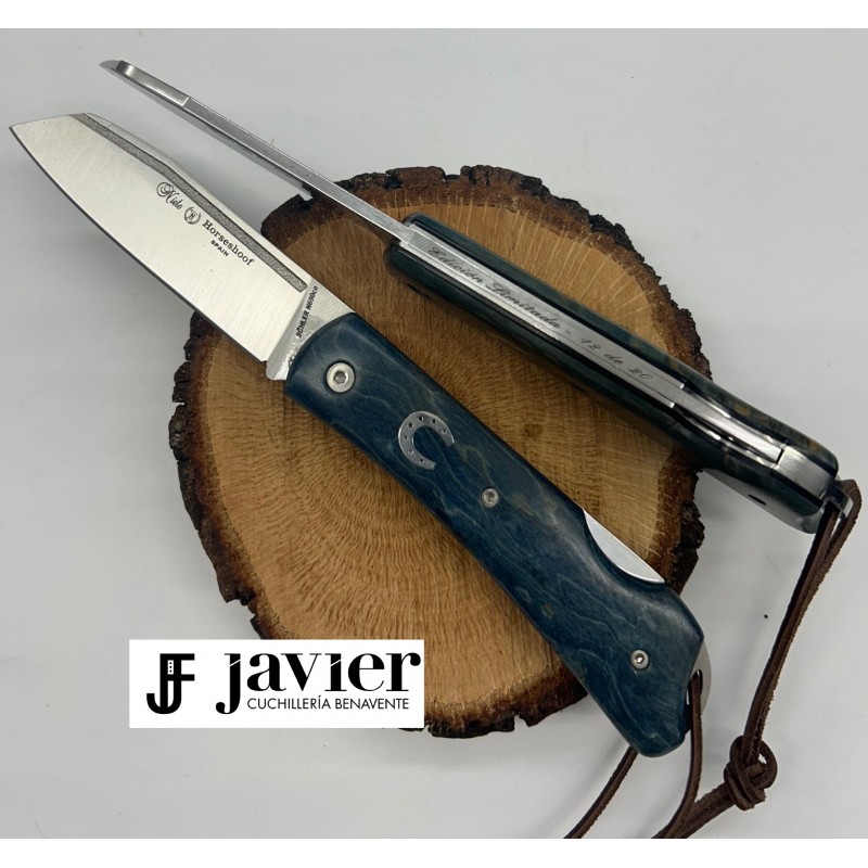 OFERTA ULTIMAS UNIDADES!! Navaja Nieto Horseshoof en madera de abedul estabilizado color azul, exclusiva para Cuchilleria Javier en edición limitada de 20 unidades grabas en el lomo. Longitud hoja 8 cts, acero Bohler N690 cobalto, amolado plano hasta el lomo e inicio en ángulo. Incrustación de herradura en acero inox. Canal en ambos lados de la hoja. tornillería allen, y hoja pulido a espejo.