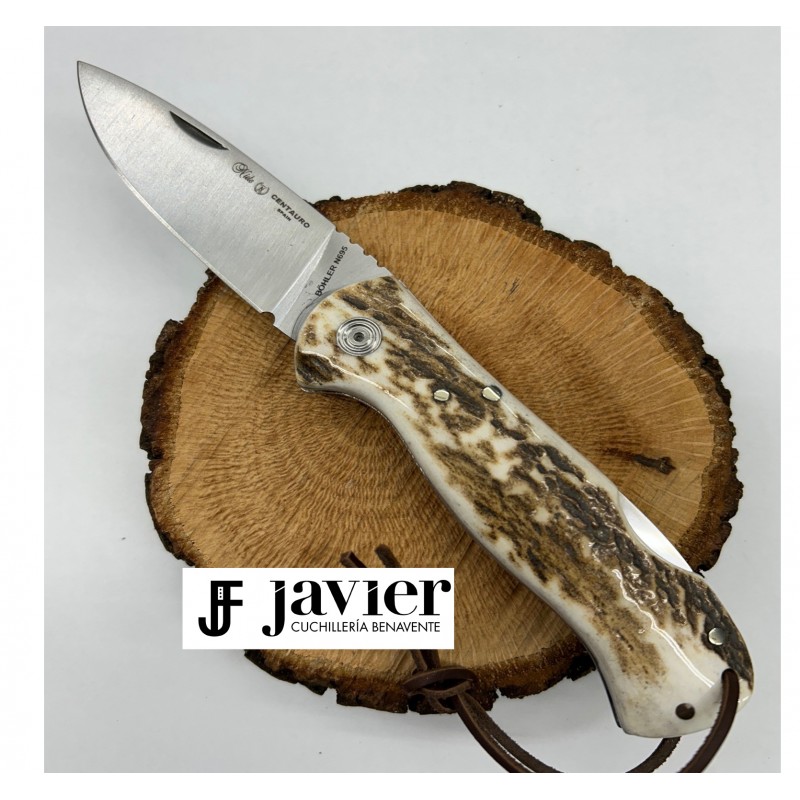 Exclusiva Navaja NIETO CENTAURO BOHLER N695 en CIERVO, fabricada en España con hoja de acero Bohler N695 DE 7,8 cts y con sistema de bloqueo lock-back. Se trata de unas unidades hechas en este tipo de mango con ciervo, que no son producidas de forma habitual con este tipo de mango.