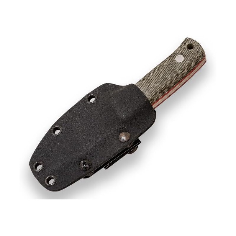 Cuchillo Erizo en Canvas verde y funda de Kydex. Hoja enteriza en acero bohler N695, mango en canvas verde con separadores rojos.