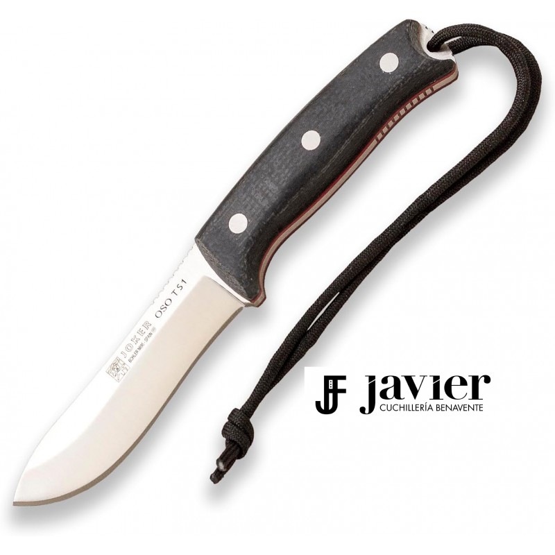 Cuchillo OSO modelo CM140 de Joker, hoja de acero Böhler N695, fabricado en España. Enterizo de una pieza, remachado con remaches de acero, mango en mikarta NEGRA con separadores rojos, tamaño de hoja 11 cm, grosor de hoja 4 mm con funda de piel de primera calidad.