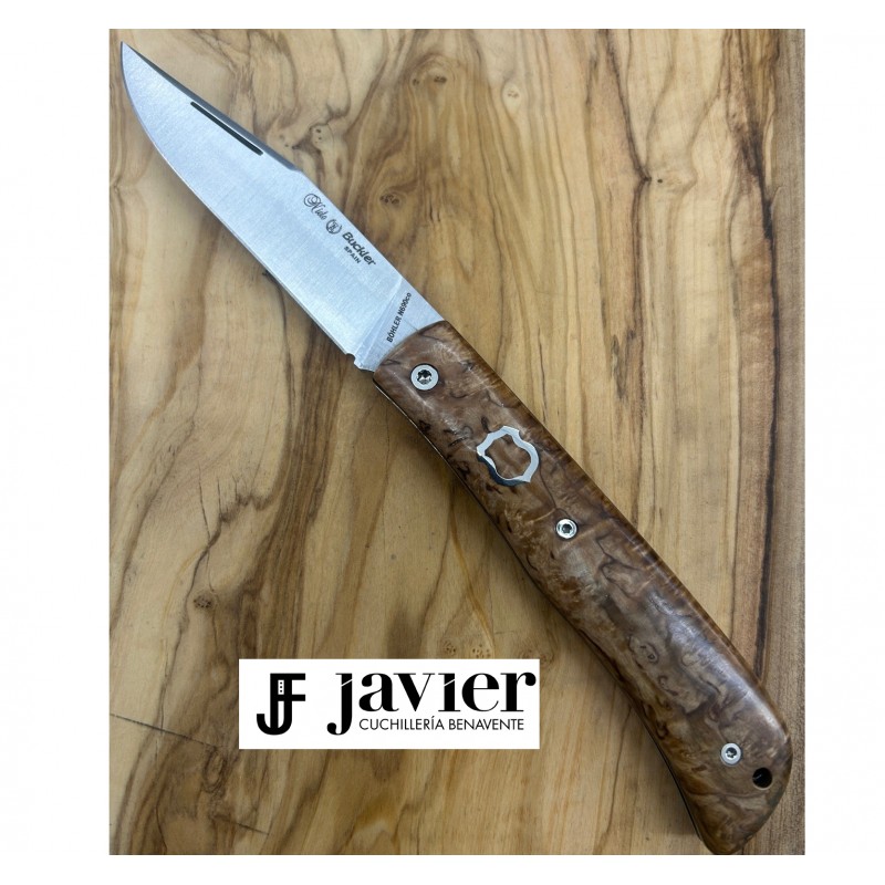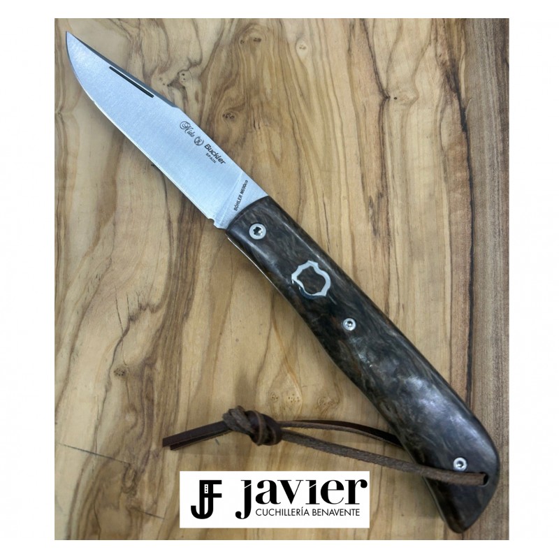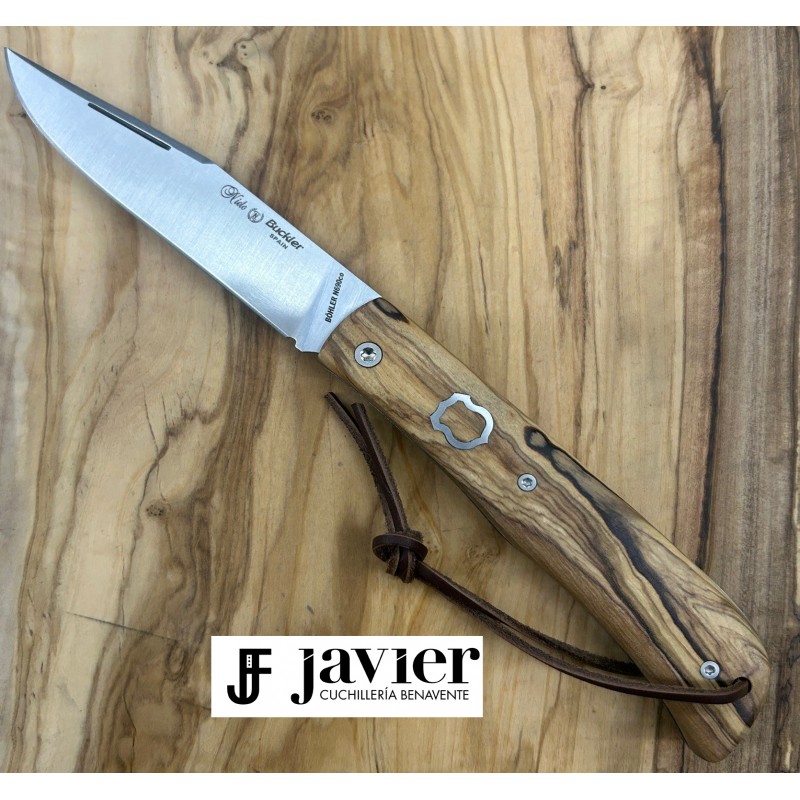 Novedad!! Navaja exclusiva de Nieto del modelo Buckler con mango en varias terminaciones de mango e incrustacion de logo en inox. Sistema de cierre de pistón forzado a dos tiempos. Virola en inox 304. Hoja de 9 cms en Acero Bohler 690 Cobalto.