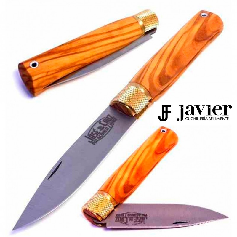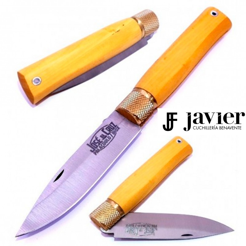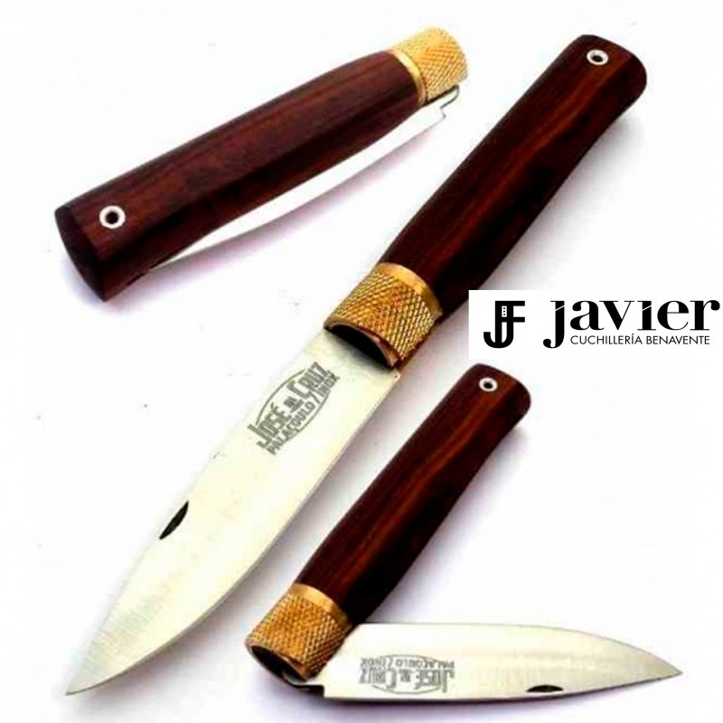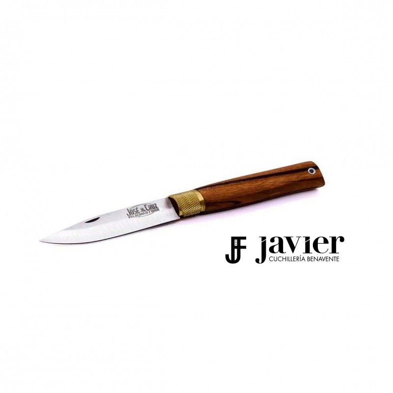 Modelo Merendeira, hoja de acero mova, con uñero para abrir con mejor facilidad, con virola de latón, y mango en distintas maderas, con agujero para cordón fiador, sistema de cierre con virola giratoria de latón, tamaño de hoja de 8,5 cm, tamaño mango 10,5 cm, con caja de la marca.