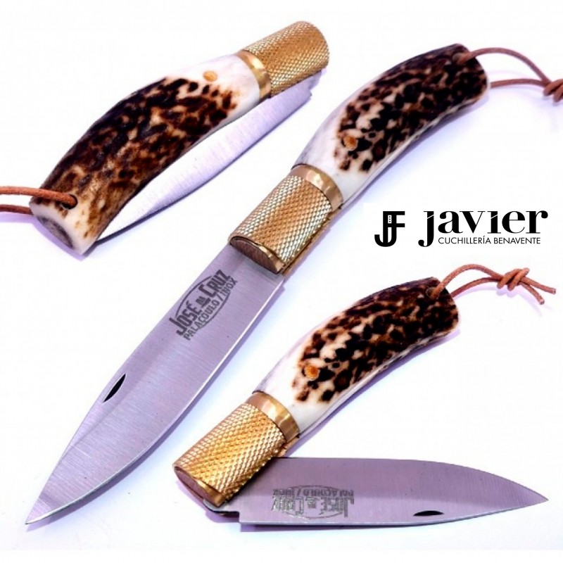 Navaja portuguesa realizada por José Da Cruz de tipo cabritera con hoja de acero inoxidable. Empuñadura natural de asta de ciervo. Sistema de bloqueo con virola giratoria de latón.
