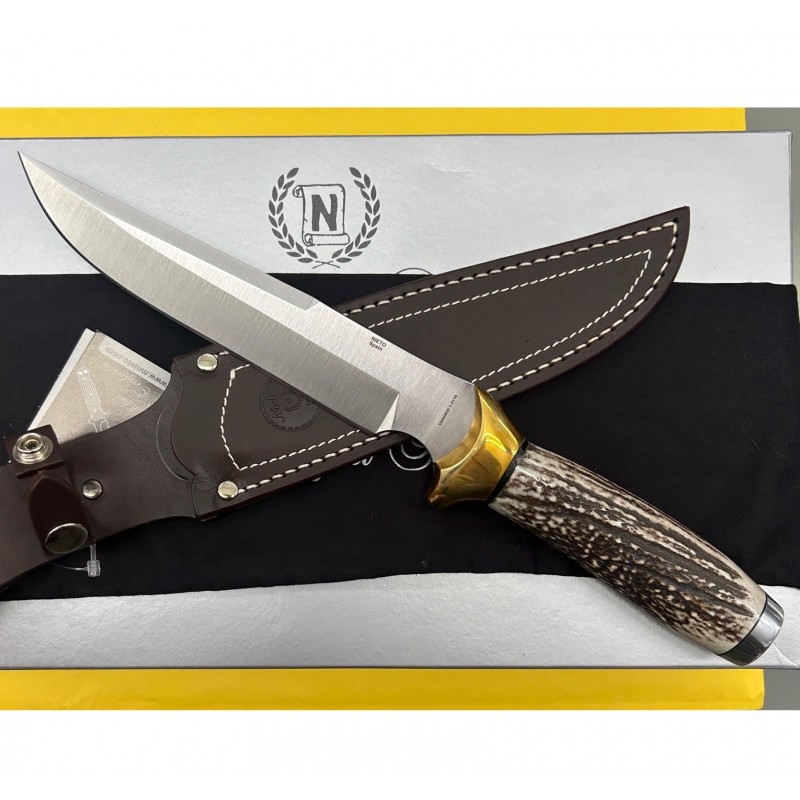 Cuchillo de Cetreria descatalogado de Nieto, con mango de ciervo y virola en laton. Longitud de hoja 21 cm, y longitud total 35 cm. Incluye funda de cuero de excelente calidad. Peso aprox 600 gramos. Cuchillo único.