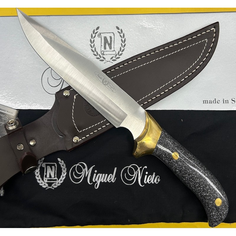 Cuchillo Cetreria Granito Nieto, descatalogado de Nieto, con mango de granito y virola en laton. Hoja enteriza en acero 440-C. Longitud de hoja 21 cm, y longitud total 35 cm. Incluye funda de cuero de excelente calidad. Peso aprox 900 gramos. Cuchillo único.