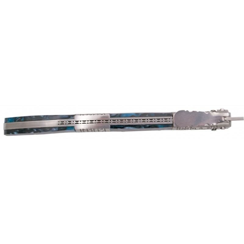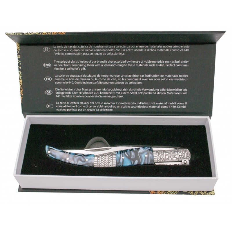 Navaja de carraca Third Serie Seda Zafiro N55AD, con hoja de acero 440 en brillo espejo en varios tamaños disponibles y mango de acero inoxidable con bajo relieve decorativo e inserciones de acrílico azul, inspirada en navajas clásicas del siglo XIX. Incorpora muelle y palanquilla decorada. Incluye caja de presentación.