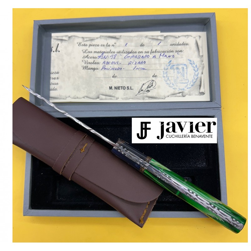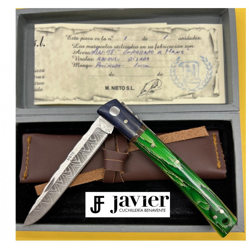 Navaja exclusiva ARTESANAL modelo Amigo de Nieto con mango en polimero y virola en abedul rizado.