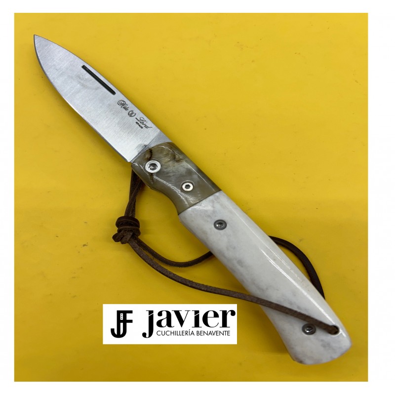 Novedad!! Navaja Lord Nieto, mango en hueso pulido y virola de carnero, sujeta con tornillería torn. Hoja de 8 cm en acero vanadio 1.4116, y cierre de piston a dos tiempos. Incluye agujero para cordón fiador de cuero.