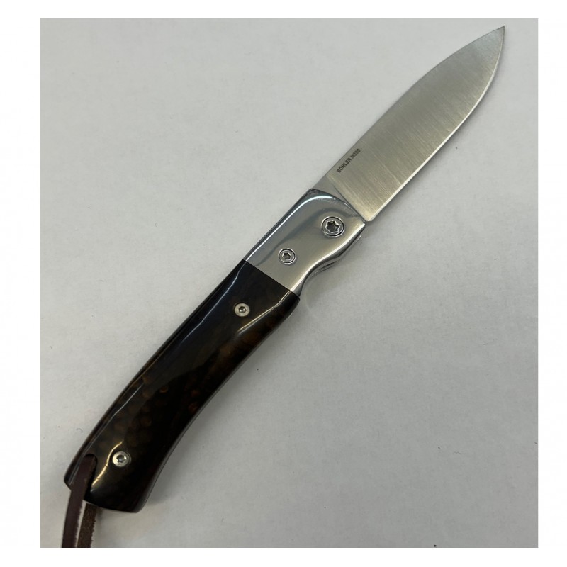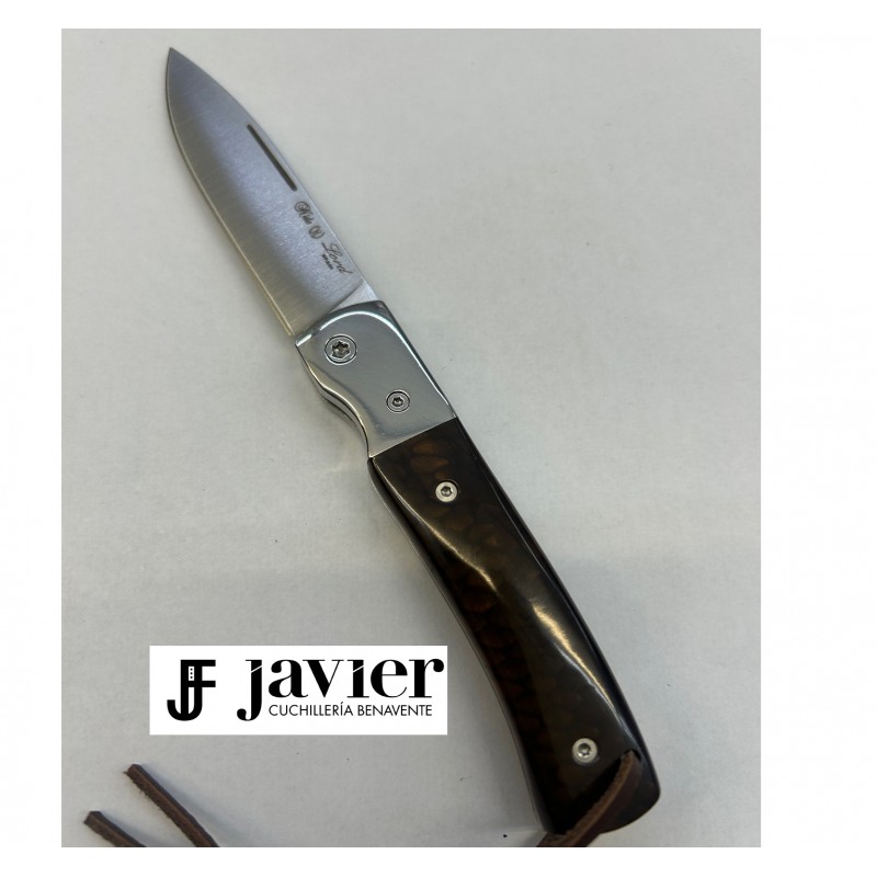 Novedad!! Navaja Lord Nieto, mango en Juma marrón y virola en inox, sujeta con tornillería torn. Hoja de 8 cm en acero bohler m-390, y cierre de piston a dos tiempos. Incluye agujero para cordón fiador de cuero.