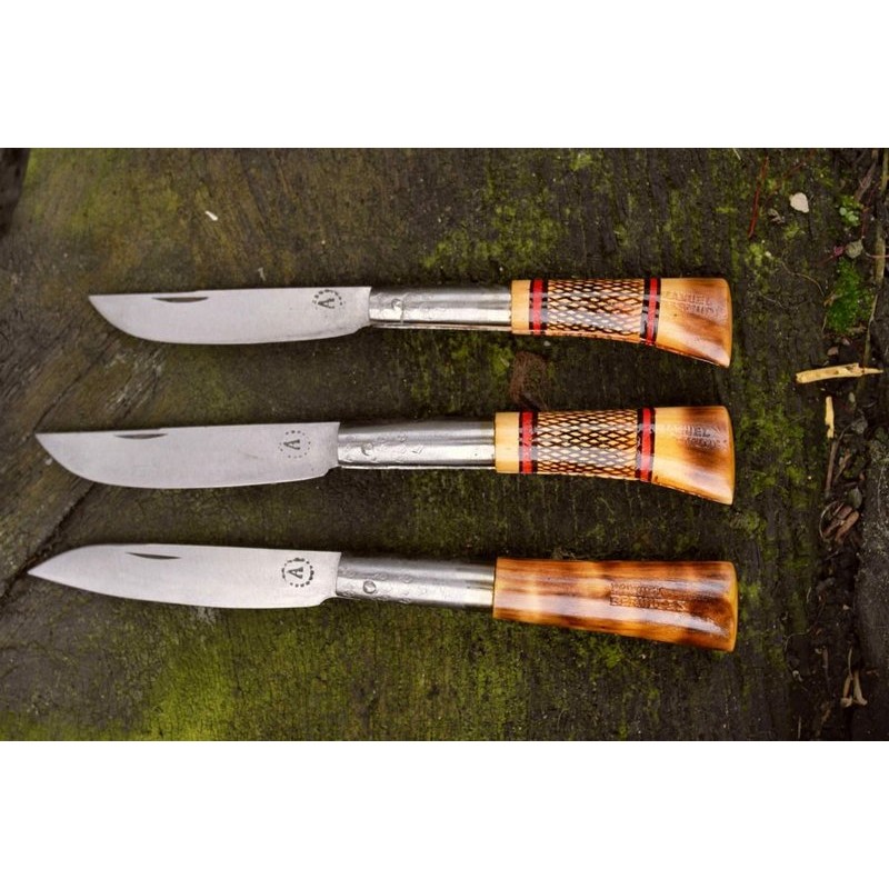 Navaja con mango de bog decorado, y hoja punta vuelta en acero al carbono de 8,5 cm. Dimensiones totales: 19,5x2,5x1,5 cm .Navaja del taller de José Luis Bermúdez.