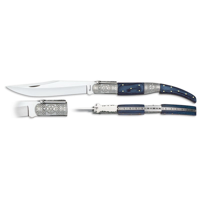 Navaja carraca con mango de stamina azul y virolas labradas.