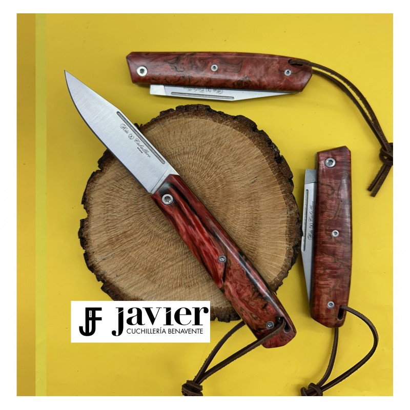Oferta de verano, con gastos envio incluidos. Navaja Caballero en Abedul estabilizado rojo con cierto veteado oscuro. hoja de acero Bohler N690 amolado plano hasta el lomo, mango de ebano, atornillada, sistema de cierre de pistón a dos tiempos. Tamaño de hoja de 7,5 cm, mango de 9 cm, grosor 3mm de hoja